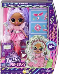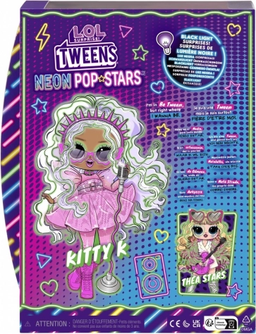 Zakorači na pozornicu s Kitty K iz serije L.O.L. Surprise! Tweens Neon Pop Stars – modnom lutkom nadahnutom pop scenom. Djeca će obožavati njezin upečatljiv izgled, duge ljubičasto‑ružičaste pramenove i blistav outfit koji se može kombinirati s bogatom opremom dodataka. Zahvaljujući black light iznenađenjima UV svjetlo otkriva dodatne efekte i motive koji igru podižu na novu razinu.