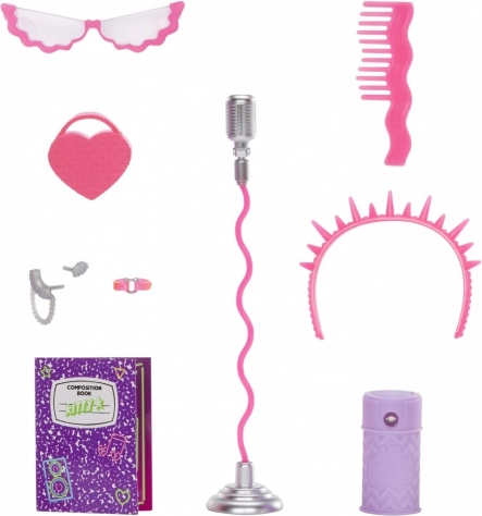 Set nudi mnogo zabave za kreativnu igru, styling i nastupe na kućnoj “pozornici”. Lutka je zglobna za prirodno poziranje, a s dodacima kao što su mikrofon, gitara i naočale u obliku srca inspirira na beskrajne priče.