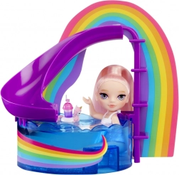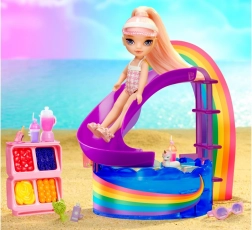 Sadržaj pakiranja: Ekskluzivna mala sestrica u outfitu, bazen s toboganom u bojama duge, stalak za smoothie s mikserom, voće i mnogo dodataka. Prikladno za djecu od 3 godine naviše.