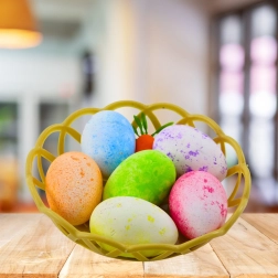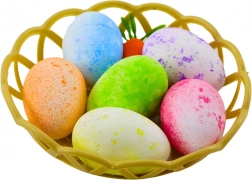 Ovaj prekrasan uskrsni set sastoji se od šarenih jaja s suptilnim mrljama i stilizirane plastične mrkve smještene u plastičnoj košarici s detaljno razrađenim dizajnom, savršen je za stvaranje proljetne atmosfere. Jaja su izrađena od laganog i izdržljivog polistirena, dok plastična košarica osigurava stabilnost i jednostavno održavanje.