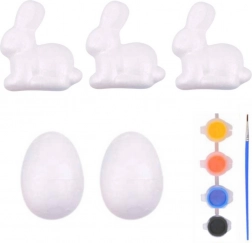 Set sadrži tri polistirenska zeca i dva polistirenska jaja. Dio seta su i četiri intenzivne boje i kist koji omogućuju lako i precizno bojenje.