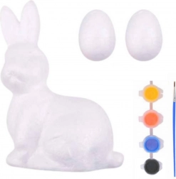 U ovom kreativnom setu pronaći ćete polistirenskog zeca i dva polistirenska jaja. Zahvaljujući priloženim bojama u intenzivnim nijansama i kistu, oslikavanje je jednostavna i ugodna aktivnost. Ovaj set razvija kreativnost i ručne vještine, omogućujući stvaranje jedinstvenih ukrasa za uskrsni stol, vijence ili košarice. Gotove figurice bit će prekrasan dio blagdanske atmosfere koja će interijeru dati izuzetnu proljetnu atmosferu.