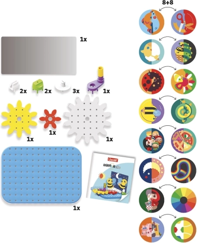 QUERCETTI MIRRORELLO je kreativna edukativna igračka koja povezuje kretanje zupčanika s dojmljivim zrcalnim efektom. Djeca okreću ručku, pokreću šarena kola i promatraju kako se ilustrirani diskovi u zrcalu pretvaraju u iznenađujuće, uvijek nove uzorke. Zabava koja istodobno vježba koordinaciju oko–ruka i potiče maštu.