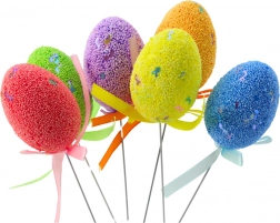 Uljepšajte proljetni dekor elegantnim setom od šest uskršnjih jaja na štapiću. Svako jaje ukrašeno je sitnim kuglicama i decentnim „notama“, dopunjeno mašnicom u usklađenoj boji. Zahvaljujući laganoj dekoraciji od stiropora, pastelnim bojama i fleksibilnoj žici, aranžiranje je jednostavno i efektno – idealno za bukete, žardinjere, vijence i blagdanski stol.