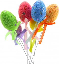 Kreirajte veselu proljetnu dekoraciju u trenu. Set sadrži 6 dekorativnih jaja na štapiću u različitim bojama koja će se lijepo isticati u vazi s grančicama, u cvjetnoj tegli ili u pletenim aranžmanima. Lagani polistiren s površinom prekrivenom kuglicama i sitnim uzorcima djeluje razigrano i elegantno u isto vrijeme.