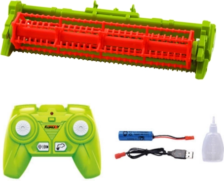 - RC kombajn s hederom, daljinski upravljač, akumulator 3,7 V 500 mAh, USB punjač, ispusta cijev, posudica za vodu za dim, originalno pakiranje