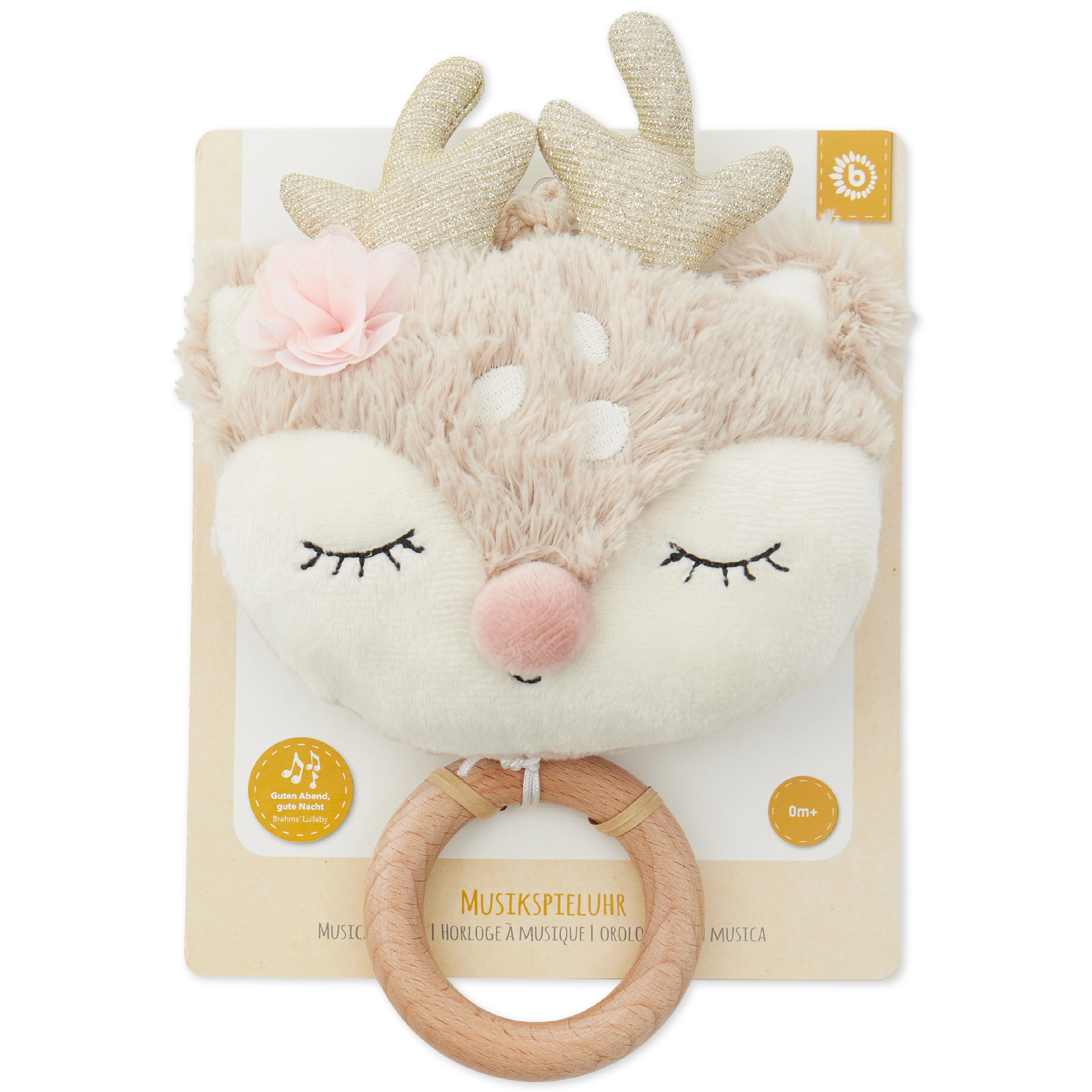 Zahvaljujući vezicama igračku brzo pričvrstite na krevetić, kolica ili autosjedalicu. Drveni prsten služi za udobno navijanje glazbenog mehanizma.