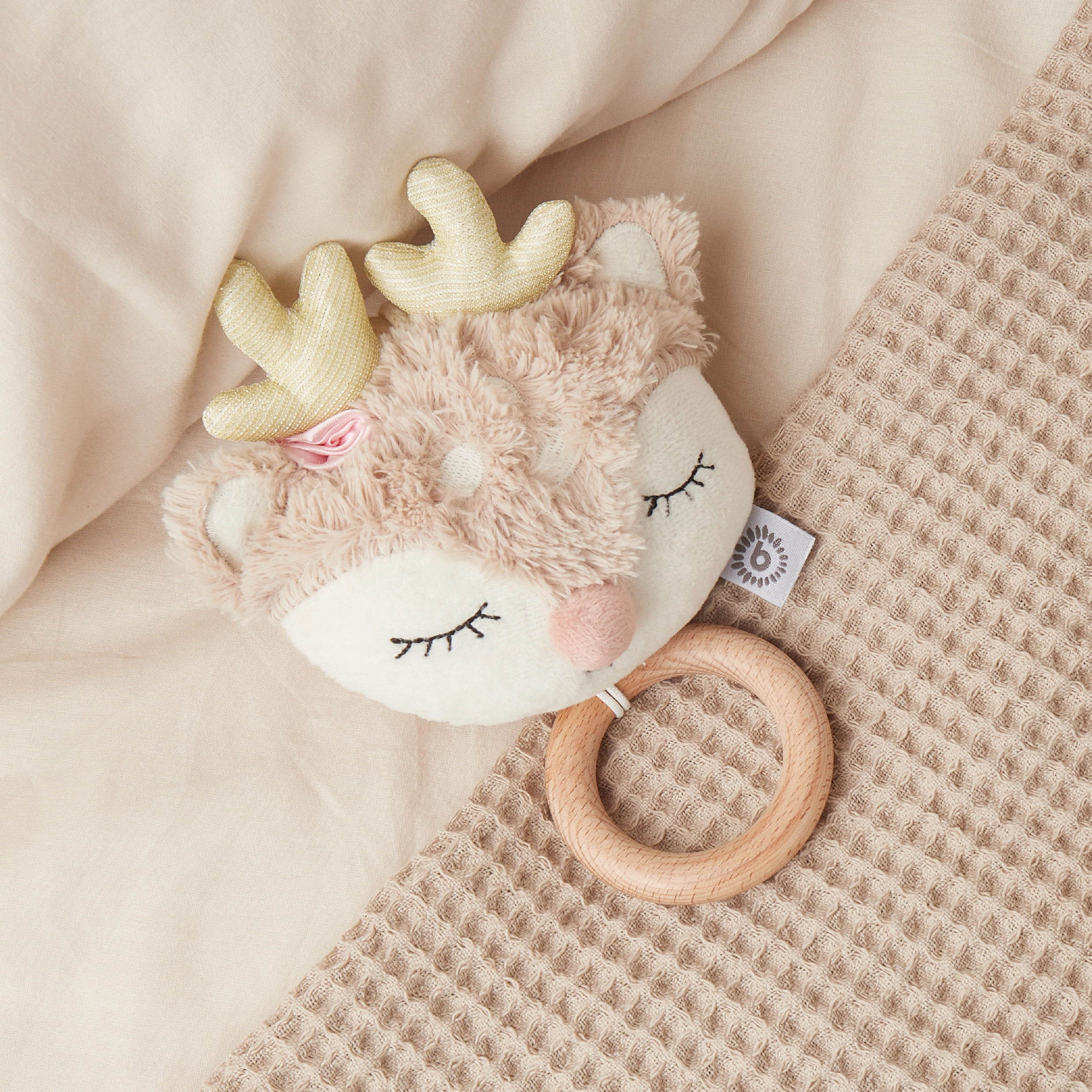 Meke tkanine ugodne su na dodir i potiču na hvatanje, što podupire osjetilni razvoj najmlađih. Zahvaljujući praktičnim vezicama igračka čvrsto stoji na krevetiću, kolicima i autosjedalici – posvuda gdje je vašem djetetu potrebno smirenje.