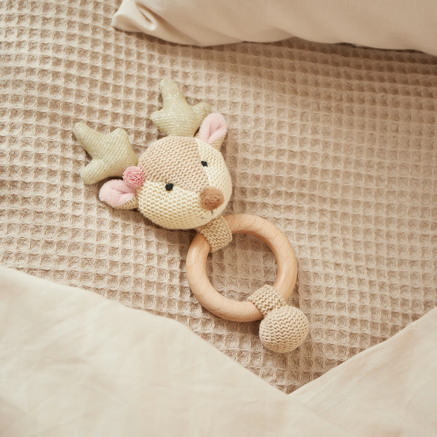 Ova stilska motorička igračka s drvenim prstenom i tekstilnim lanetom idealna je za prve mjesece života. Kombinacija prirodnog drva i meke tkanine potiče osjetilnu percepciju, finu motoriku i koordinaciju ruka–oko. Elegantni dizajn u pješčanim tonovima razveselit će i djecu i roditelje.