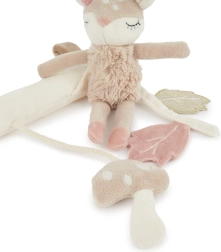 Preslatka viseća igračka s motivom lančeta Elle razveselit će bebe od rođenja i potaknuti njihov razvoj. Zahvaljujući praktičnim čičak-trakama lako je pričvrstite na kolica, autosjedalicu ili baby gym. Igračka nudi senzornu stimulaciju kroz različite teksture i zvukove: listići šuškaju, lanče zvecka, a gljivica ugodno vibrira/rrrrka. Izrađena je od mekanog i plišanog poliestera, nježnog prema osjetljivoj dječjoj koži.