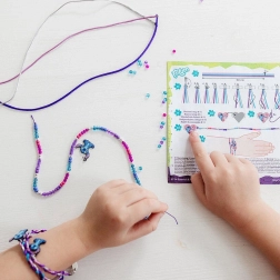 Ovaj sjajan kreativni set nudi ti mogućnosti da izraziš svoju kreativnost i izradiš jedinstvene dodatke. Uz pomoć satenskih uzica u živim bojama možeš izraditi stilske pletene narukvice, koje su upotpunjene premium gumenim privjescima sa Stitchem. Ovi privjesci tvojim narukvicama daju razigran i jedinstven izgled. Osim toga, možeš izraditi i elegantnu narukvicu s perlicama, koja sadrži šarene staklene perlice i srebrne okrugle perlice. Tvoja narukvica završava velikim privjeskom u obliku srca sa slikom Stitche i Angel.