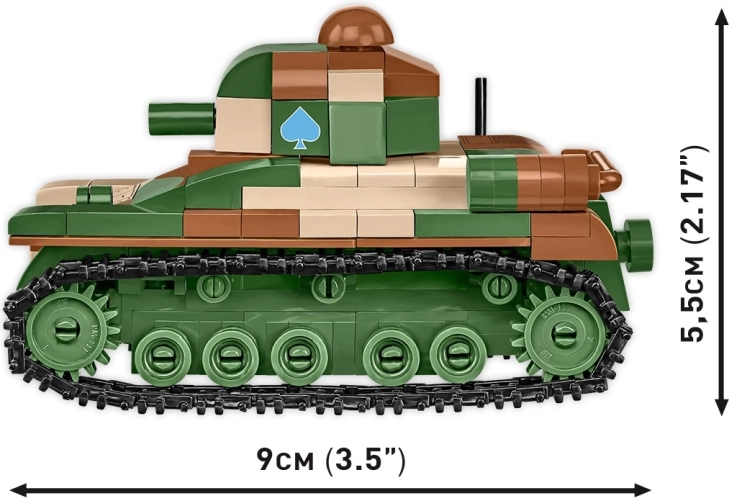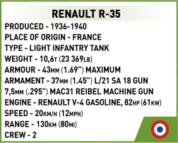 Sastavite kultni laki pješački tenk s početka Drugog svjetskog rata. COBI RENAULT R-35 u mjerilu 1:48 nudi 258 kvalitetnih dijelova, rotirajuću kupolu, pokretni gusjenični podvoz i detaljne otiske uključujući francuske i poljske ambleme. Odličan izbor za kolekcionare i djecu – za igru i za izložbu.