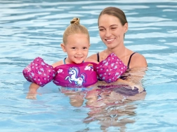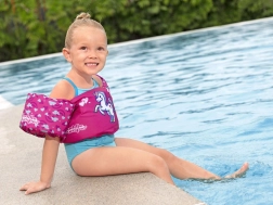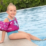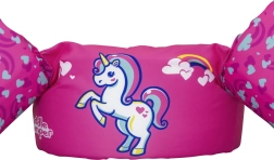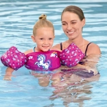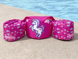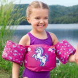 Ružičasti motiv s jednorogom, srčekima i dugom motivira djecu na igru u vodi i povećava njihovo samopouzdanje pri učenju plivanja.