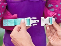 Čvrsta plastična kopča s podesivim remenom kopča se straga, pa sigurno drži i djeca je ne mogu sama otkopčati.