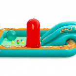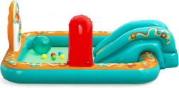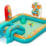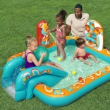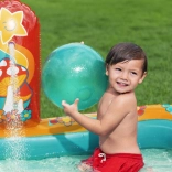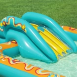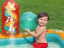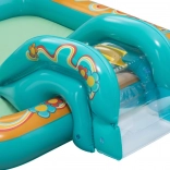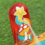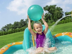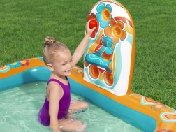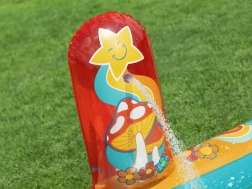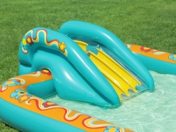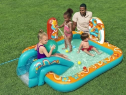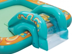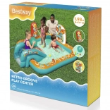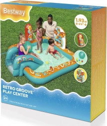 Napuhavajući centar za igru BESTWAY Retro Groove pretvara vaš vrt u šareno vodeno igralište. Stabilan tobogan čvrsto pričvršćen za dno vodi u plitki bazenčić, a za osvježenje se brine vodena prskalica koju jednostavno spojite na crijevo. Retro grafika i dodaci u obliku loptica i plažnog balona potiču kreativnu igru i razvoj motorike.