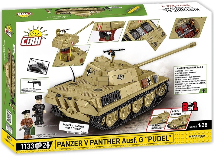 Izgradite vjeran model legendarnog tenka Panzer V Panther Ausf. G “Pudel”, koji je ušao u povijest tijekom događaja 1944. Ova COBI konstrukcijska igračka oduševit će kolekcionare te ljubitelje povijesti i tehnike: nudi precizan izgled, čvrstu konstrukciju i mnoštvo funkcionalnih detalja zahvaljujući kojima model ne samo da odlično izgleda, nego i zabavlja pri gradnji i igri.