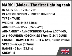 Ikona Prvog svjetskog rata za vašu kolekciju! Od 878 dijelova sastavit ćete detaljan tenk Mark I (Male) u mjerilu 1:35 od COBI-ja s funkcionalnim gusjenicama, okretljivim topovima i otvarajućim poklopcima. U paketu je i figurica britanskog tenkista, trajni otisci bez naljepnica te službena licenca The Tank Museum.