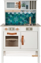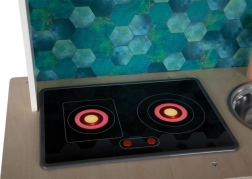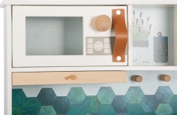 Djecu će razveseliti bogat pribor: lonac s poklopcem, tava i metalni kuhinjski pribor. Izvadiv protvan poslužit će i kao ploča za crtanje, hladnjak i pećnica imaju otisnute unutarnje površine za još veću zabavu. Stražnja ploča je obostrana – odaberite uzorak heksagonalnih pločica ili potpuno bijelu površinu koja se uklapa u svaki interijer.