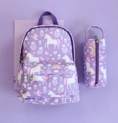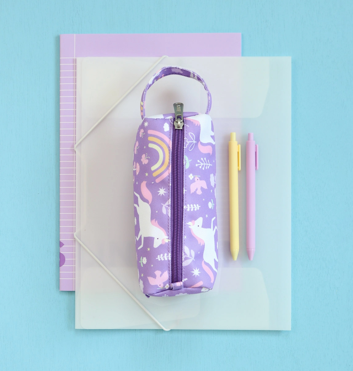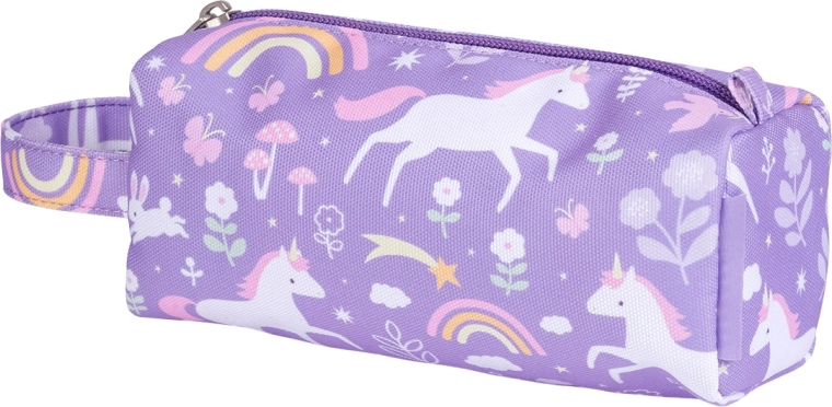 Ljubičasta torbica za bojice, flomastere ili pribor za pisanje s motivima jednoroga, cvijeća i duge izrađena od održivog poliestera. Idealna za školu, putovanja ili aktivnosti, zatvara se patentnim zatvaračem i ima udobnu ručku za lako nošenje. Osigurava sigurno spremanje vašeg pribora za pisanje.