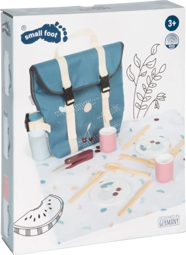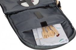 Ruksak sadrži sav potreban pribor uključujući drvene tanjure, šalice i pribor, idealno za udobno blagovanje na otvorenom.