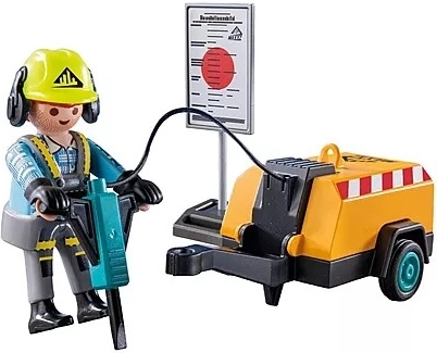 Krenite na gradilište s PLAYMOBIL ACTION HEROES – građevinskim radnikom s pneumatskim čekićem. Figurica s uklonjivom kacigom i rukavicama savladava svaki popravak ceste: pneumatski čekić spojen na kompresor realistnim silikonskim crijevom, prikolica s kukom za vuču za jednostavan prijevoz te signalizacija upozorenja za sigurni rad.