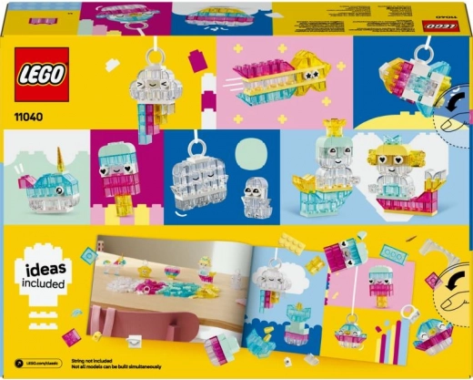 Zahvaljujući prozirnim kockicama i elementima s izrazima lica, svaka građevina oživi. Četiri vješajuća elementa omogućuju da gotove kreacije lako izložite kao ukrase u dječjoj sobi. Set je idealan za razvoj fine motorike, kreativnog razmišljanja i strpljenja – a uz to odlično nadopunjuje druge setove iz LEGO Classic linije.
