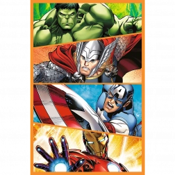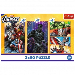 Puzzle 3x80 Akcijski Dani prikazuju sjajne scene s omiljenim superjunacima Avengersa kao što su Captain America, Black Panther, Thor, Iron Man i Hulk. Svaka slagalica nakon sastavljanja stvara sliku dimenzija 275x180 mm.