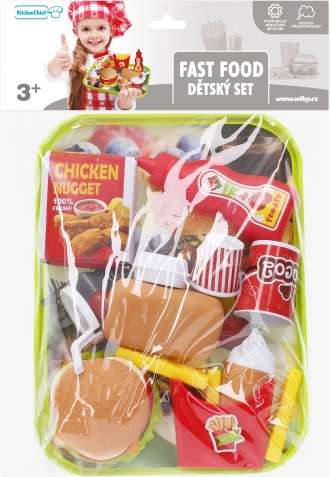 Set fast food s pladnjem nudi zabavno igranje oko posluge brze hrane. Sadrži različite vrste hrane i pribora za male kuhare.