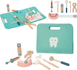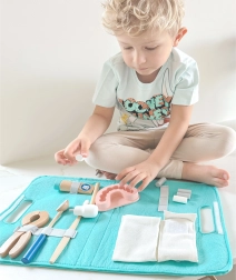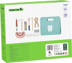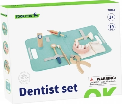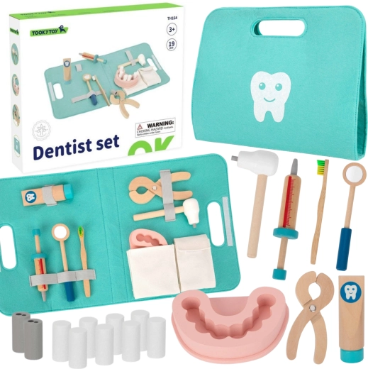 Drveni set za malog zubara marke Tooky Toy sadrži sve potrebno za igru zubara. Budući liječnici mogu davati injekcije, vaditi i pregledavati zube svojim pacijentima. Igra zubara nije samo igra uloga, već i učenje dentalne higijene i posljedica njezina zanemarivanja. Uči empatiju i suosjećajnost, što je za socijalne odnose vrlo važno. Podržava razvoj mašte i uči rješavanju problema.