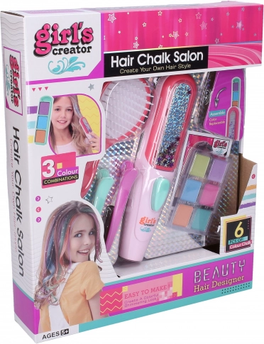Kreativni frizerski studio za jednostavno bojanje i styling. Set sadrži četku, ukosnice, kredice za kosu i aplikator boje. Sjajan dodatak za originalne frizure.