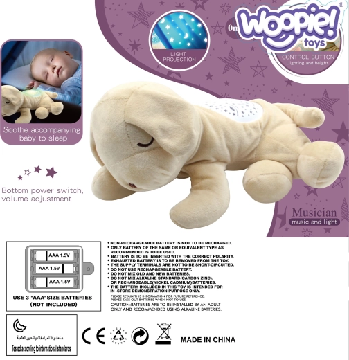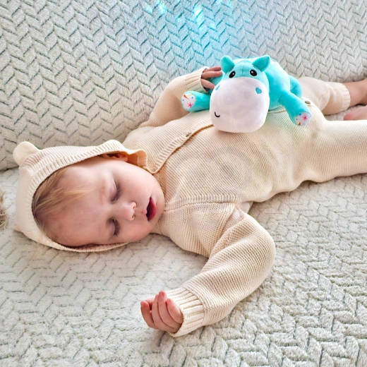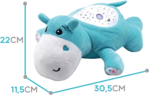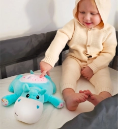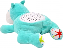 Glazbeni modul reproducira nekoliko uspavanki do 20 minuta u komadu, tako da dijete nesmetano zaspi bez potrebe ponovnog pokretanja. Upravljanje je jednostavno – gumb na trbuščiću za svjetlo i glazbu te 2 razine glasnoće za idealnu glasnoću u dječjoj sobi. Mekano tijelo ispunjeno je finom vatiranom ispunom, a mehanizam se može lako izvaditi za sigurno pranje.
