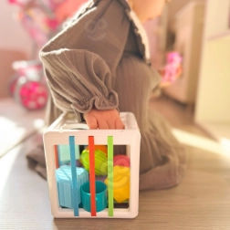 Ova šarena senzorna kocka kombinira dvije omiljene aktivnosti: umetanje dijelova kroz elastične trake i sortiranje u otvore za oblike. Djeca uče prepoznavati boje i geometrijske oblike, razvijaju znatiželju i sposobnost koncentracije. Čvrsti dijelovi lako se hvataju, a kocka ima praktičnu konstrukciju za jednostavno prenošenje i pospremanje.