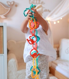 Zahvaljujući praktičnom obliku djeca karike brzo povežu u lance, njima pričvrste igračke i kreiraju vlastite šarene kombinacije – kreativna zabava kod kuće i na putu.