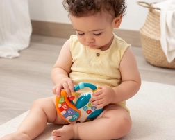 Četiri šarene tipke reproduciraju tonove i kratke melodije koje potiču ritam, slušnu percepciju i prve glazbene korake.