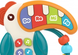 Pelikan Woopie idealna je prva glazbena igračka za najmlađe. Zahvaljujući šarenim tipkama s tonovima “Do, Re, Mi, Fa” djeca lako otkrivaju svijet glazbe, dok pomicanjem perlica i pritiskanjem tipki vježbaju finu motoriku i koordinaciju oko–ruka. Meki greben i luk s prstenovima ujedno djeluju kao grizalo za olakšanje pri nicanju zubića.