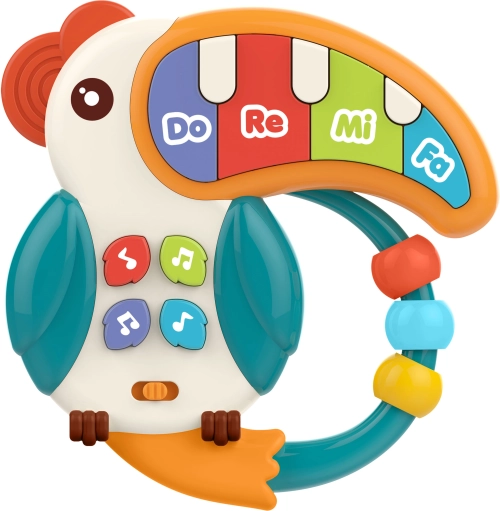 Zabavno pianino u obliku pelikana brenda Woopie spaja glazbenu igračku, senzorne elemente i grizalo 3-u-1. Četiri šarene tipke reproduciraju melodije i tonove, klizne perlice vježbaju finu motoriku, a mekani dijelovi služe kao sigurno grizalo. Igračka bez oštrih rubova potiče spretnost i koordinaciju te će oduševiti djecu od 18 mjeseci.