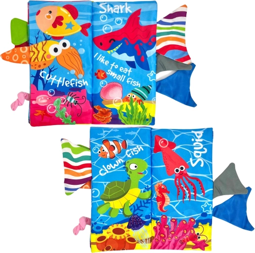 Platnena knjižica WOOPIE s morskom tematikom idealna je prva igračka za bebe od rođenja. Svaka stranica nudi šarene ilustracije i različite teksture koje mame na dodir. Izbočeni repići ribica i drugih morskih stvorenja potiču djecu na hvatanje i povlačenje, čime se prirodno jača fina motorika i koordinacija.