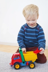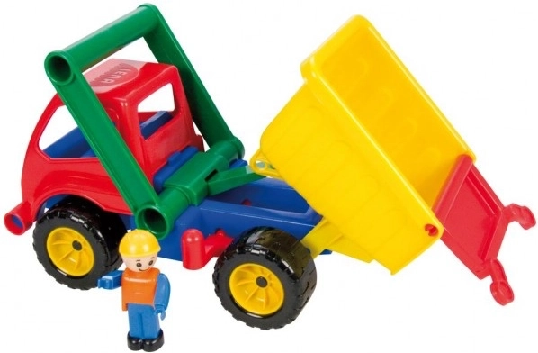 Sanduk ima praktičan osigurač protiv samovoljnog prevrtanja, a kabina se lako preklapa – unutra čeka aktivni radnik spreman za posao. Igračka tako razvija finu motoriku, koordinaciju i scenarije uloga.