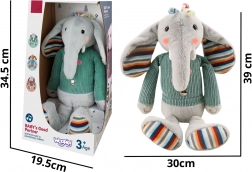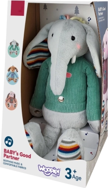 Interaktivni plišani slon Woopie opremljen je s tri senzorne zone na nogama i trbuščiću koje pri dodiru reproduciraju glazbu. Njegovi ružičasti obraščići su osvijetljeni, što stvara čarobnu atmosferu oko igračke. Plišanac je odjeven u džemper ispod kojeg se nalazi mjesto za 3 baterije. Ovaj mekani taktilni slonić postat će prijatelj djeteta na mnogo godina.