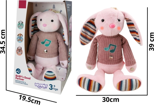 Interaktivni plišani zeko Wooppy opremljen je s tri osjetilne zone – na šapicama i trbuščiću, koje pri dodiru reproduciraju glazbu. Njegovi ružičasti obraščići su osvijetljeni, što stvara doista bajkovitu atmosferu oko igračke. Zeko je odjeven u džemper ispod kojeg se nalazi prostor za 3 baterije. Ovaj na dodir mekani zeko postat će prijatelj djeteta na mnogo godina.