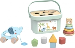 Ovaj svestrani set potiče dječji razvoj kroz igru: djeca razvrstavaju oblike u poklopac sortera, slažu raznobojne prstene na štap piramide s medvjedićem te vježbaju hod i koordinaciju s vučnim slonom. Sve se nakon igre sprema u kutiju na zatvaranje s ručkom, pa je red za tren.