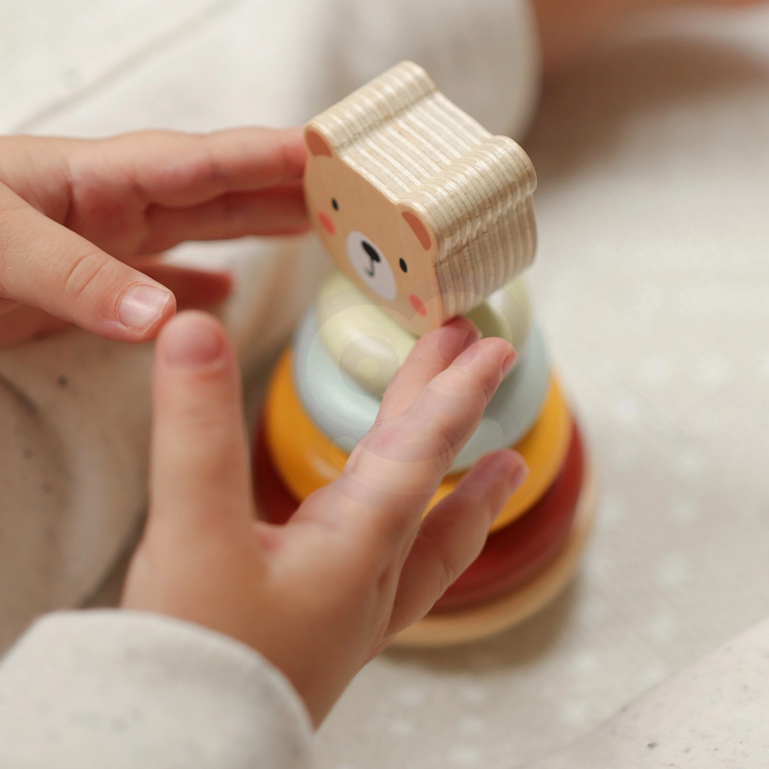 Šareni prsteni lako se slažu i potiču koordinaciju oko–ruka, razumijevanje veličina i strpljenje. Slatki medvjedić motivira na daljnje pokušaje.