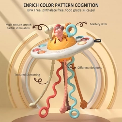 Otkrijte multifunkcionalnu senzoričku igračku u obliku UFO-a, koja kombinira grizalo, zvečkicu i interaktivne „potezne” uzice. Podržava razvoj motorike i koordinacije, stimulira vid, sluh i dodir te istovremeno olakšava nicanje zubića. Sigurni materijali bez BPA i jednostavno održavanje čine je idealnim izborom za bebe od 6 mjeseci.