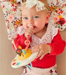 Ova dječja montessori igračka WOOPIE BABY u obliku UFO-a nudi bogate senzoričke poticaje zahvaljujući šest uzica s različitim teksturama i bojama, trima mekim gumbima i jednom čvrstom kliznom tipkom. Povlačenje uzica izaziva različite zvukove i blage vibracije, koje potiču znatiželju i koncentraciju. Mekani rubovi i strukturirane površine pružaju olakšanje osjetljivim desnima tijekom nicanja zubića.