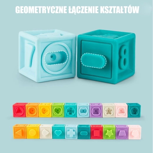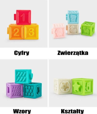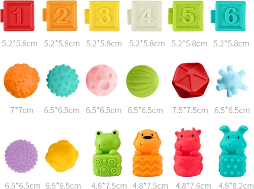 Otkrijte zabavne i edukativne WOOPIE BABY senzorne kocke koje pri pritisku pište te zahvaljujući raznim teksturama, bojama i reljefima potiču dječja osjetila. Set od 20 dijelova s brojevima, matematičkim znakovima, životinjama, geometrijskim oblicima i voćem podržava koordinacijske vještine, finu motoriku i učenje računanja. Kocke su mekane, ugodne na dodir, mogu se međusobno spajati te služe i kao grickalica za djecu od 6 mjeseci.