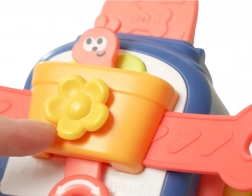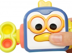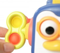 Bučkasti pingvin sadrži pokretne elemente – pritiskom na nos igračka zavrnji i oči se počnu pomicati.