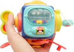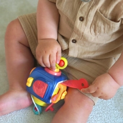 Kocka nudi različite teksture, uzorke i šarene elemente koji pružaju stimulativna osjetilna iskustva te pomažu razvijati vid, sluh i motoriku djeteta. Interaktivni elementi poput iskakajućeg psića ili zvončića donose zvučnu stimulaciju. Igračka na zabavan i sveobuhvatan način potiče djetetov razvoj, što je čini izvrsnim izborom.