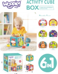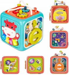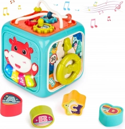 Osim glazbenih funkcija, kocka sadrži umetaljku s 4 oblika i slovima, okretni sat, zupčanike, volan s autićem te kugličasti labirint. Robustna plastika, zaobljeni rubovi i netoksične boje osiguravaju sigurnu igru od prvih mjeseci. Napajanje: 3× AA (nisu uključene).