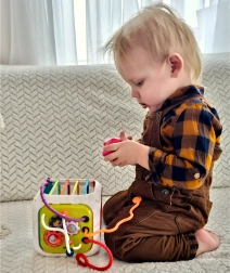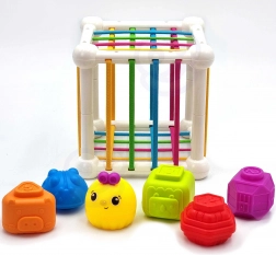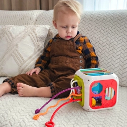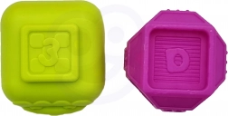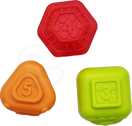 U kompletu je 6 čvrstih senzoričkih kockica s različitim oblicima, strukturama i bojama. Svaki dio ima broj, što olakšava slaganje po redu i prvo brojanje. Blokovi se mogu spajati u toranj, a zahvaljujući zveckavim elementima djeci su zanimljivi i kao zvečkice.