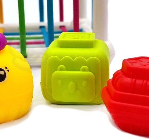 Šest čvrstih kockica s različitim površinama i bojama potiče znatiželju, razvija osjet dodira i vida te uči djecu bojama i oblicima.